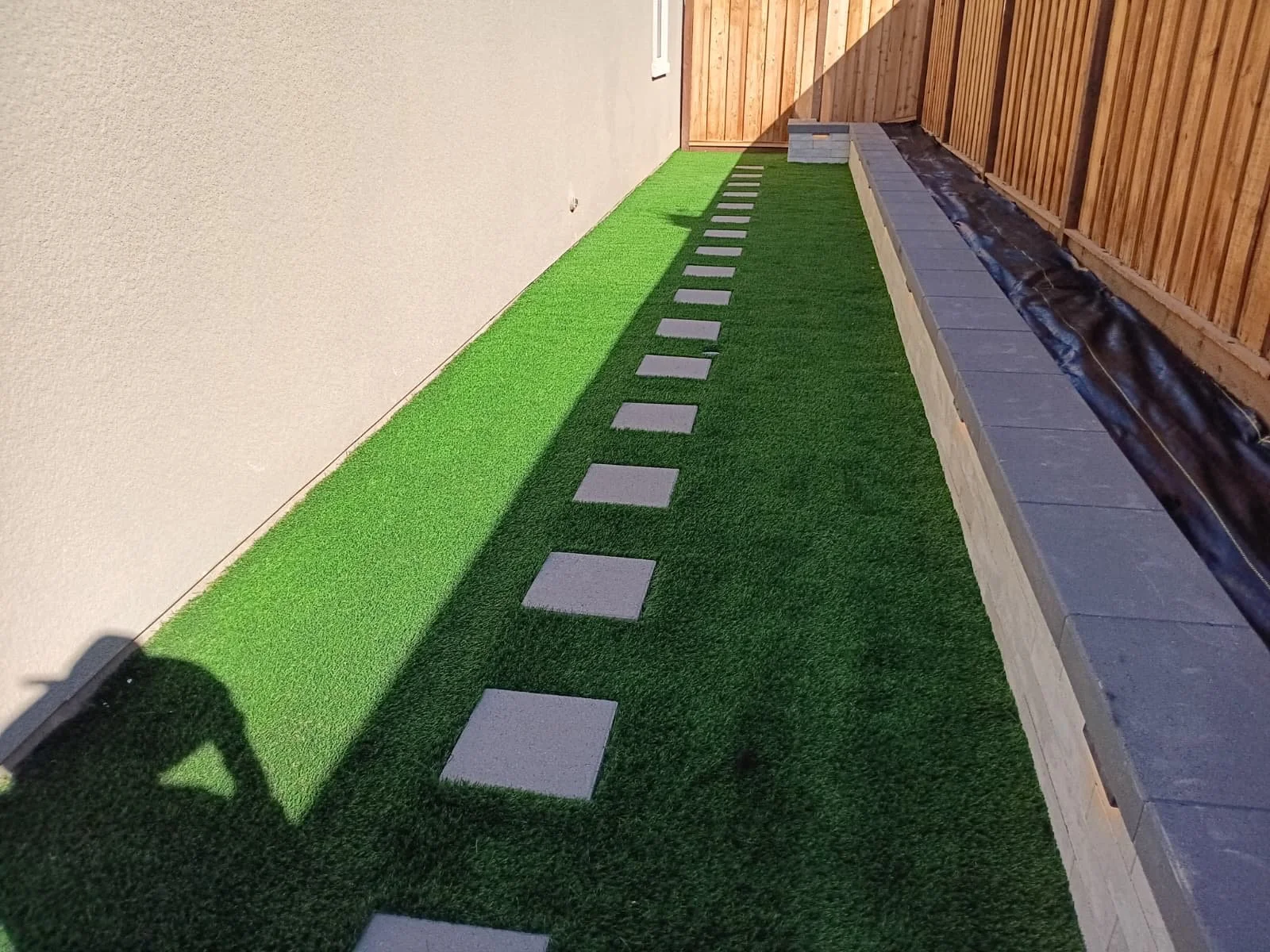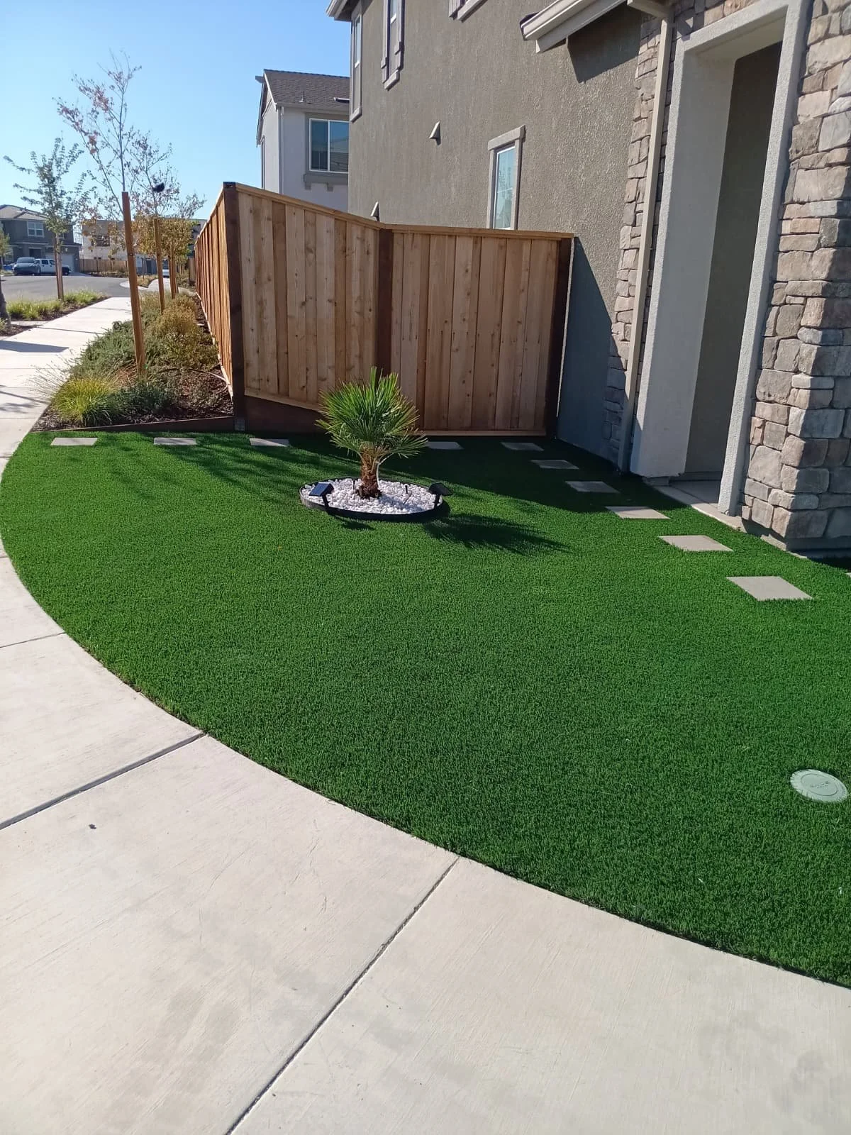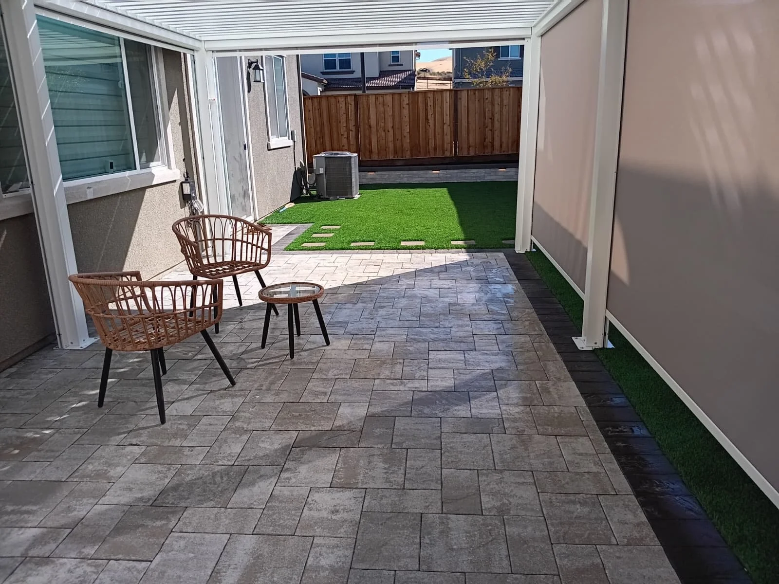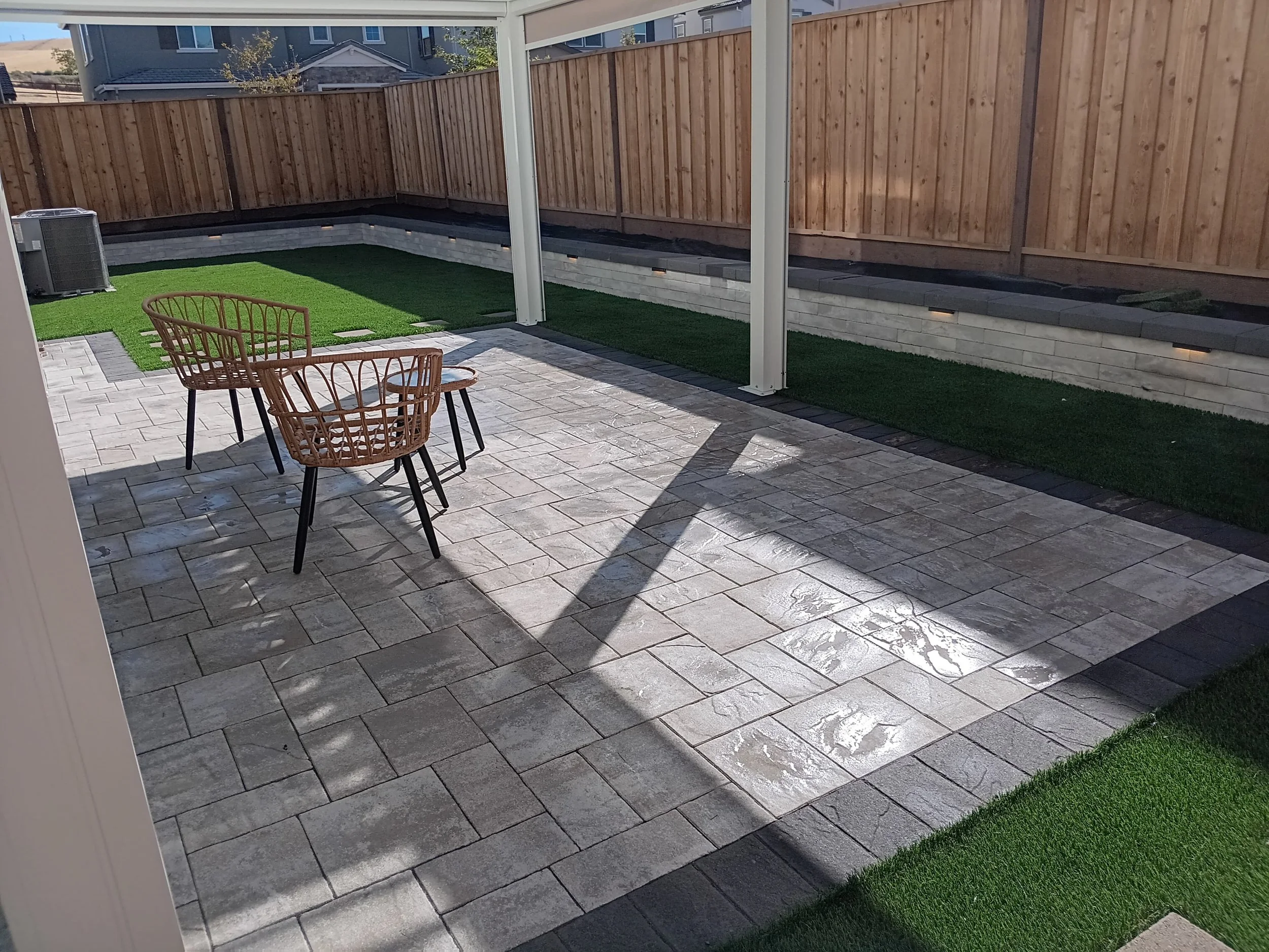 In this bay area project, our team designed and built a stunning outdoor living space that combined both functionality and style. We installed a modern structural retaining wall to define the yard, added elegant pavers, and transformed the landscape with lush, low-maintenance artificial turf. To create the perfect shaded retreat, we installed a sleek louvered pergola that offers adjustable light control throughout the day. The project was completed with a custom driveway extension that seamlessly tied into the home’s aesthetic.
